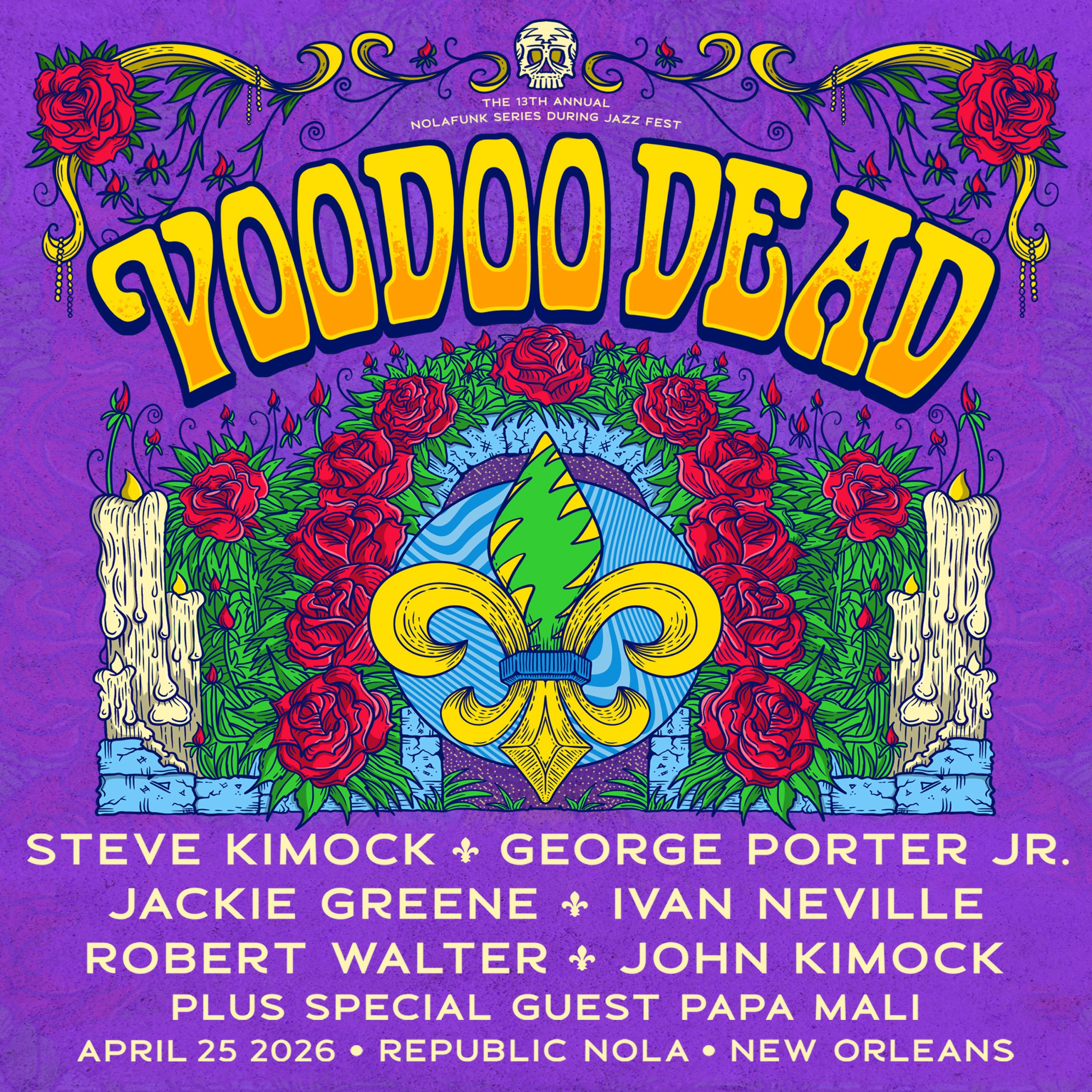 Voodoo Dead rides again featuring Steve Kimock, George Porter Jr., Jackie Greene, Ivan Neville, Robert Walter, John Kimock Plus Special Guest Papa Mali at the 13th Annual Nolafunk Series During Jazz Fest.